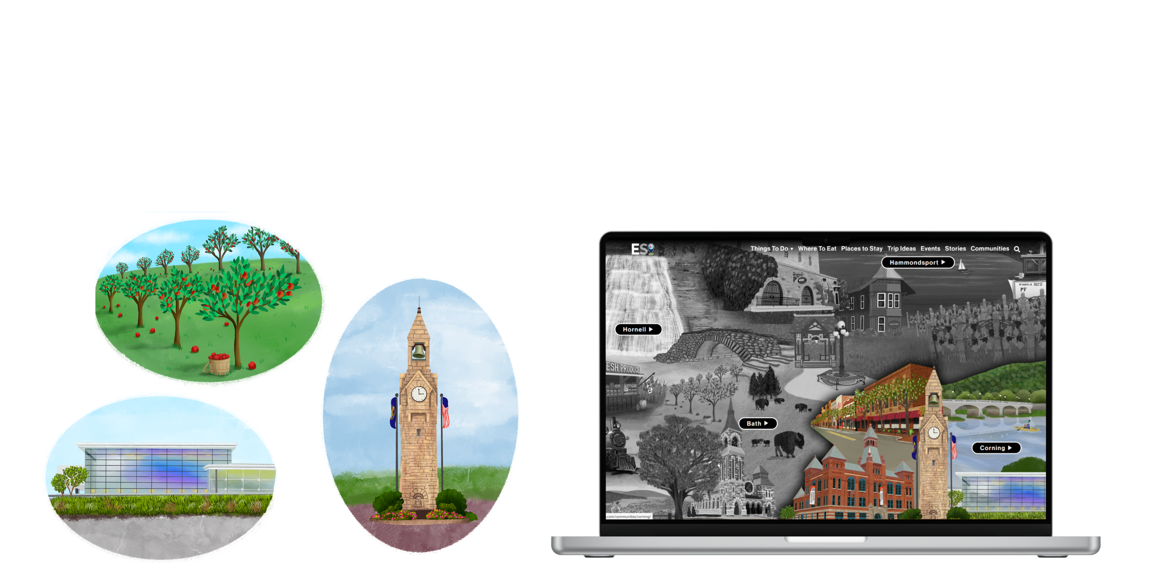 I created a series of 20 vignettes for the Steuben County tourism website. The illustrations were turned into an interactive montage.