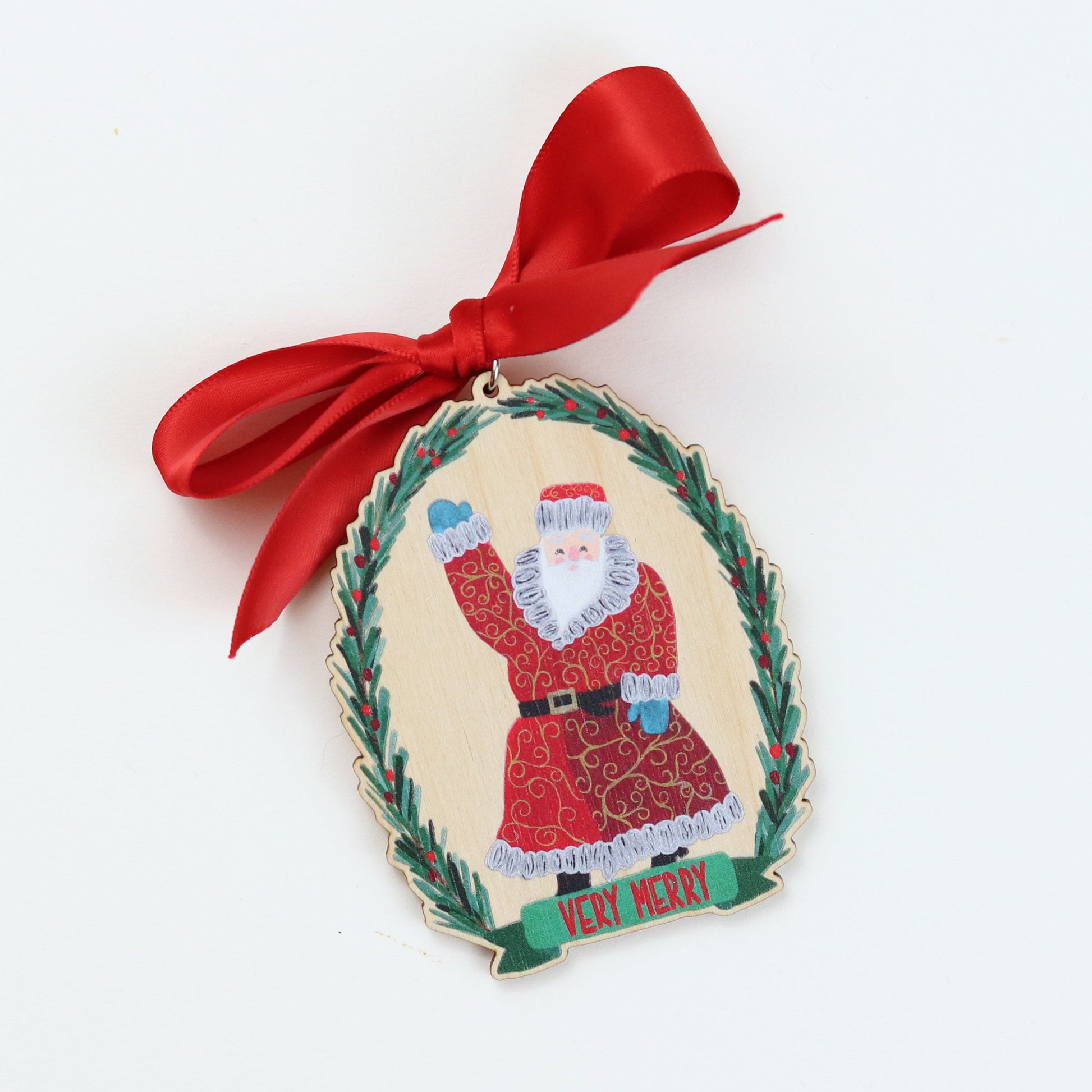 Add timeless elegance to your holiday decor with this vintage-inspired Santa ornament. Illustrated in rich gouache and ink, this dapper Santa is dressed in a luxurious fur-trimmed coat with gold detailing, a matching fur hat, and cheerful blue mittens. He waves as he walks, framed by evergreen branches dotted with red berries, and stands atop a red banner that reads “Very Merry” in hand lettering.