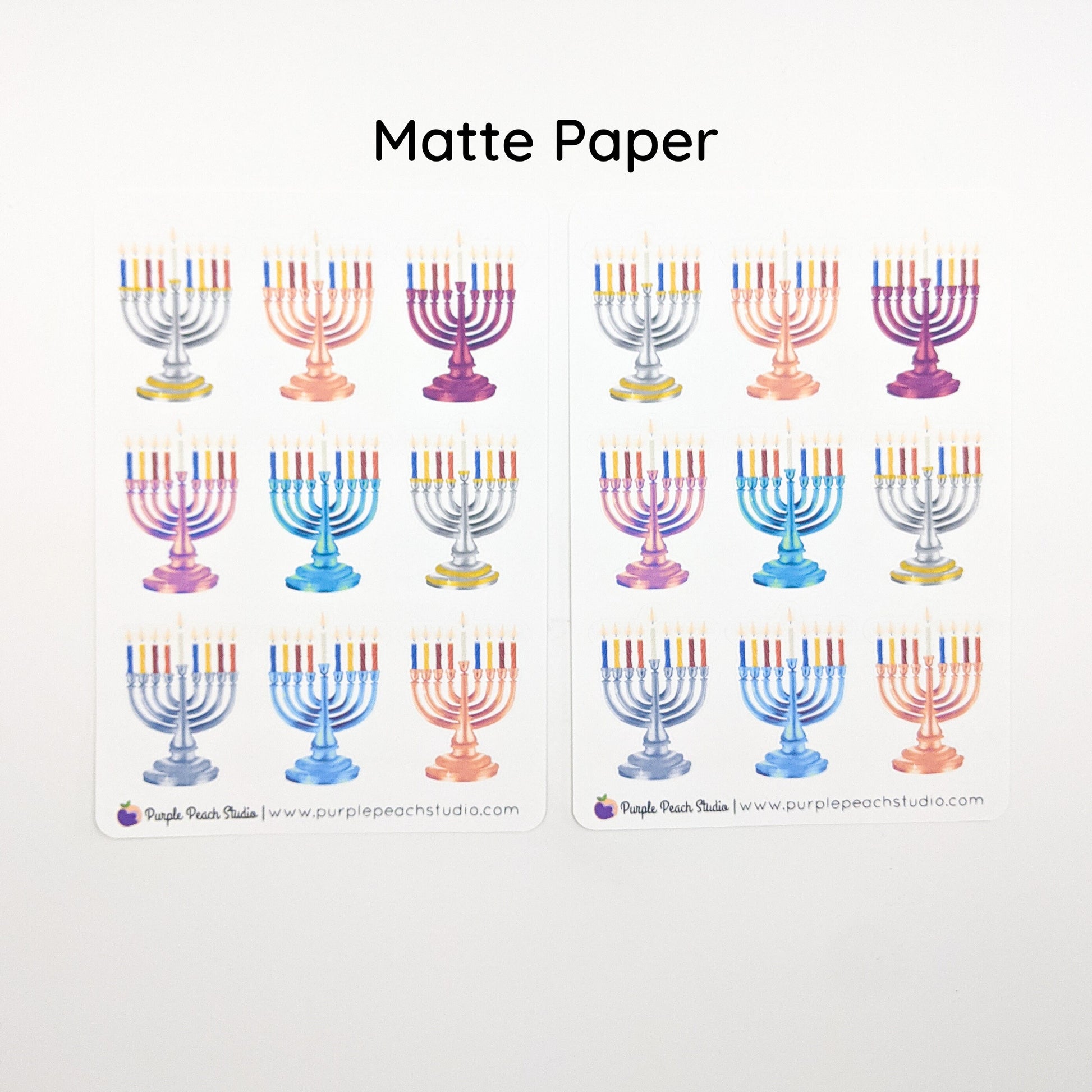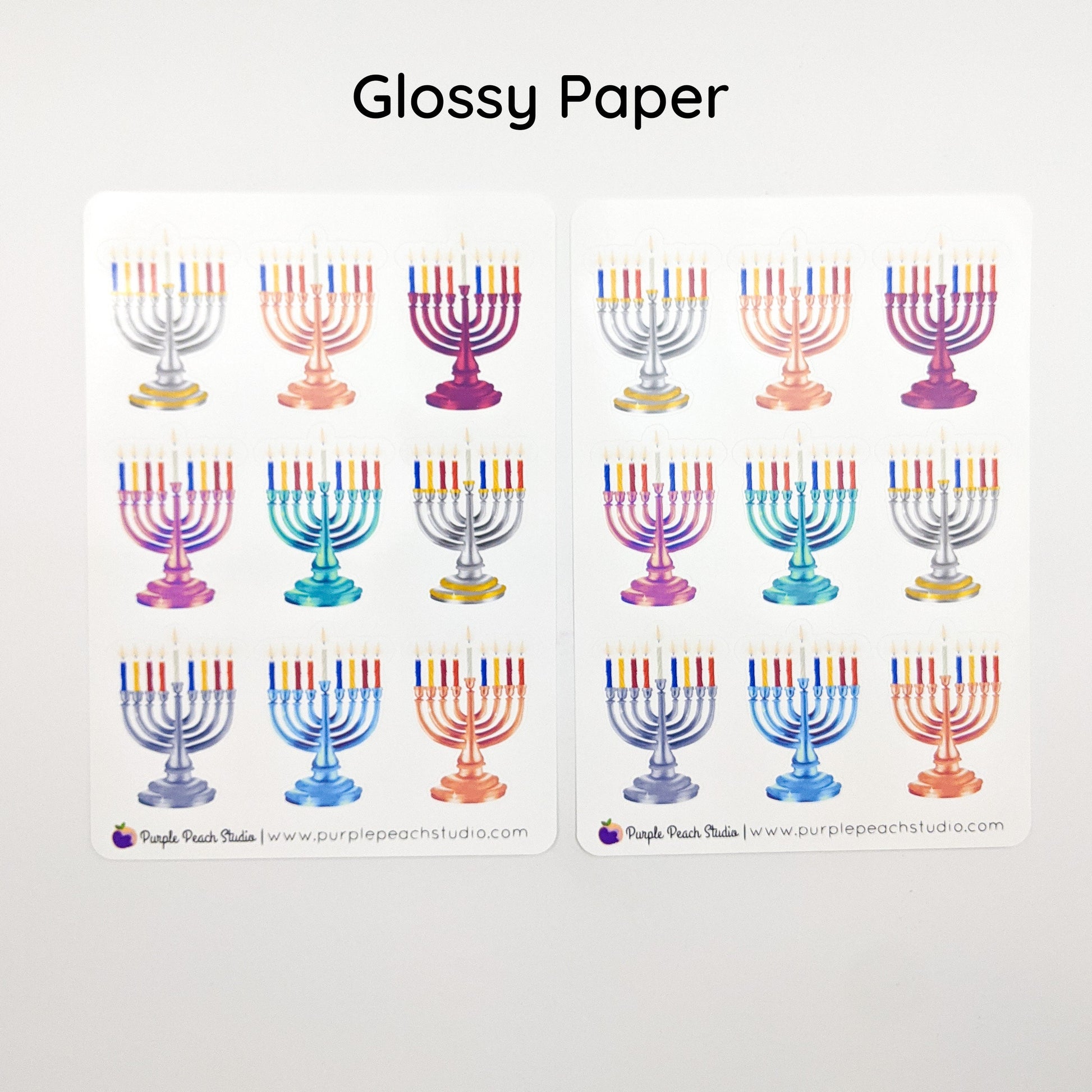 Each large sticker sheet measures 5" x 7" and includes 9 hand-drawn menorah stickers, each featuring all nine candles lit in a joyful tribute to the Festival of Lights. The menorahs are illustrated in vibrant jewel tones—including sapphire blue, emerald green, ruby red, and amethyst purple—for a colorful and cozy holiday vibe.