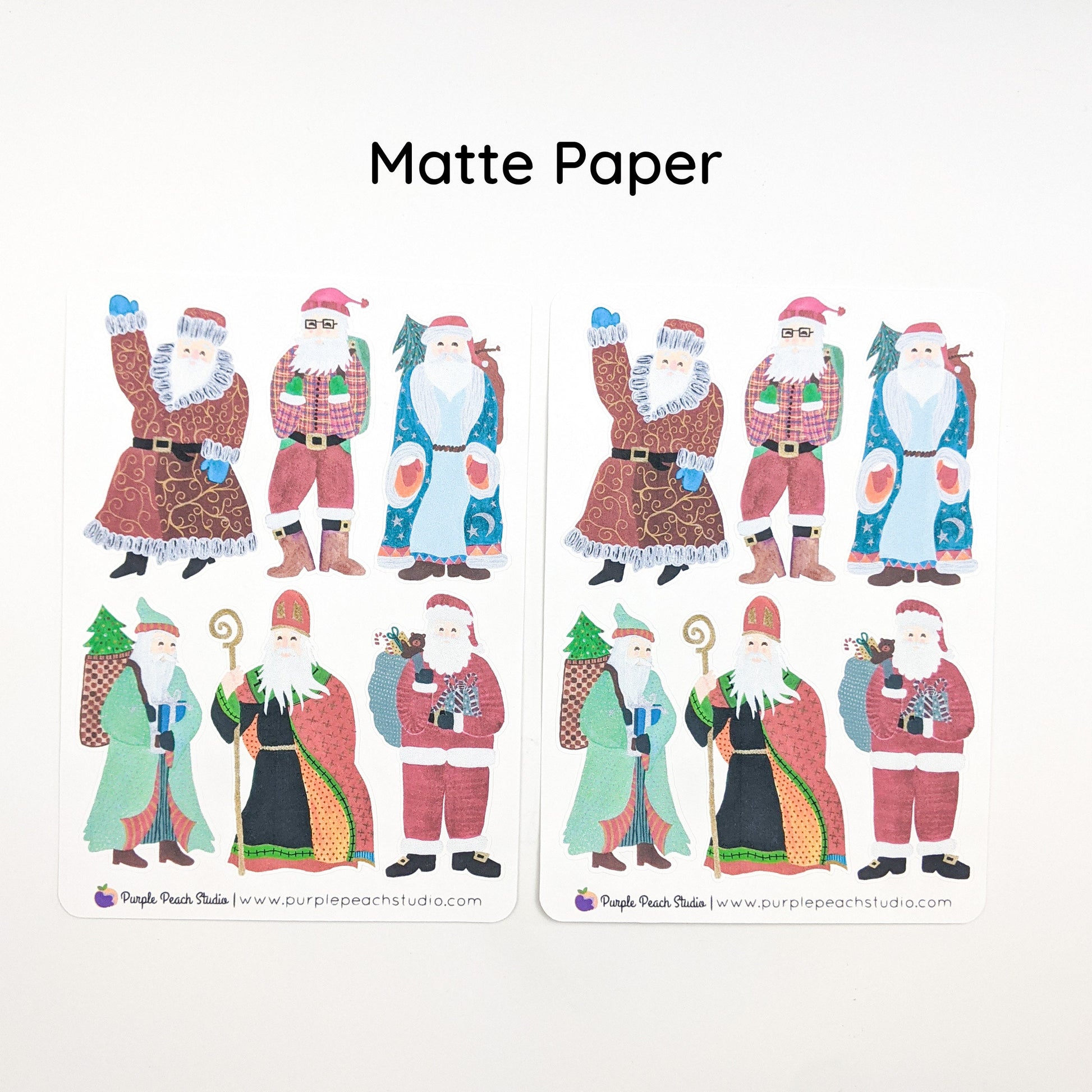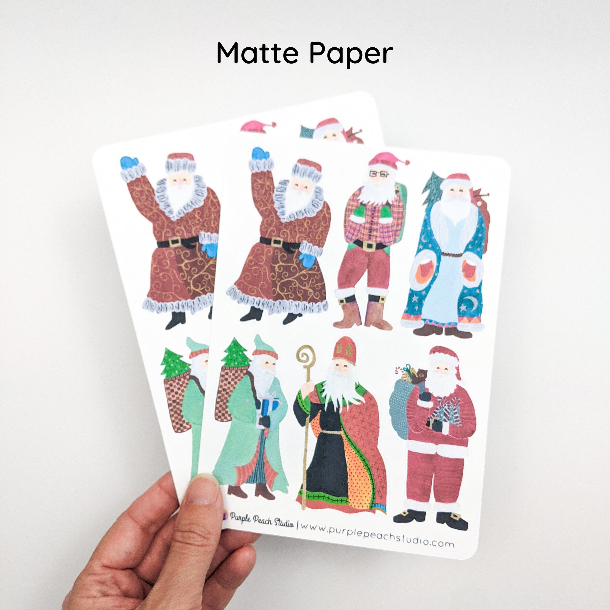 Bring nostalgic charm to your holiday season with these hand-painted, vintage-inspired Santa stickers. Perfect for adding personality to your Christmas cards, gifts, journals, and winter crafts, each sheet is filled with whimsically illustrated Santas in classic holiday scenes—carrying gifts, dashing through the snow, and spreading cheer.